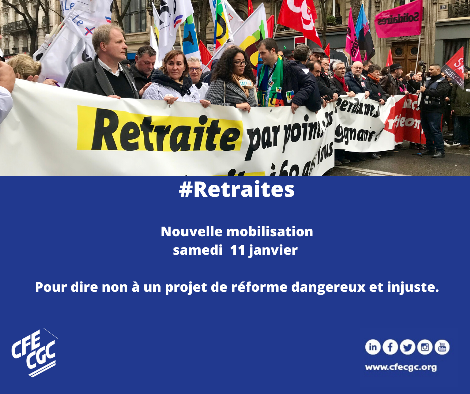 Retraites : 36 jours sans trêve, on continue ! Appel à manifester, samedi 11 janvier, dans tous le pays. A Paris, le cortège partira de Nation et le rendez-vous est à 13h30 sous le ballon CFE-CGC. Le cortège se rendra à République en passant par Bastille. En régions n’hésitez pas à vous rapprocher de vos…