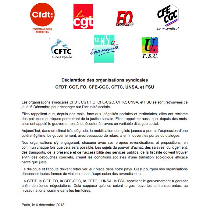 Les organisations syndicales CFDT, CGT, FO, CFE-CGC, CFTC, UNSA, et FSU se sont retrouvées ce jeudi 6 Décembre pour échanger sur l’actualité sociale.