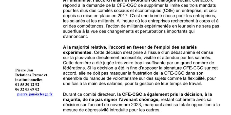 -Communiqué de presse- La CFE-CGC signe les accords en faveur de l’emploi des salariés expérimentés et relatif à l’évolution du dialogue social, mais pas l’avenant sur l’assurance chômage.
