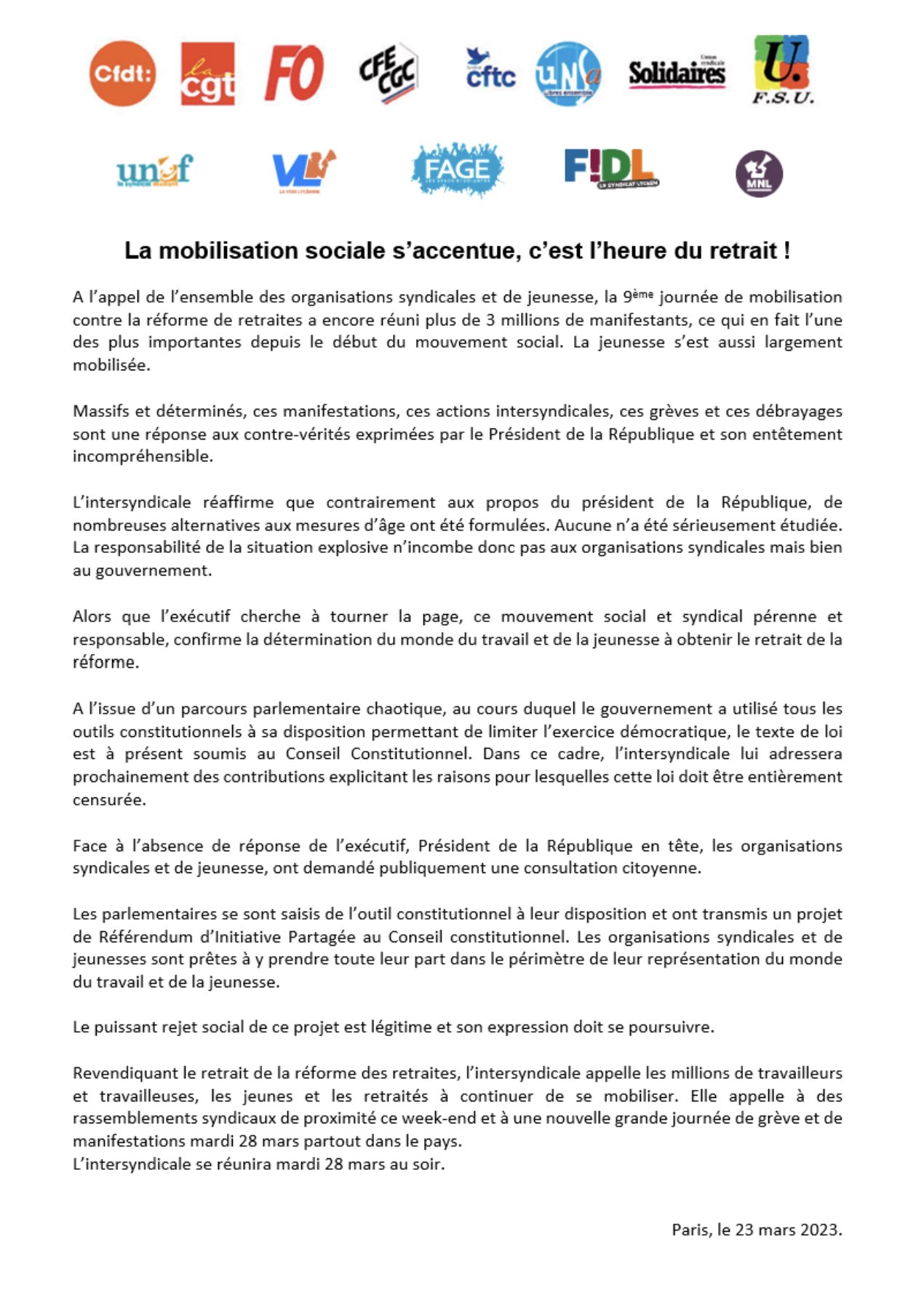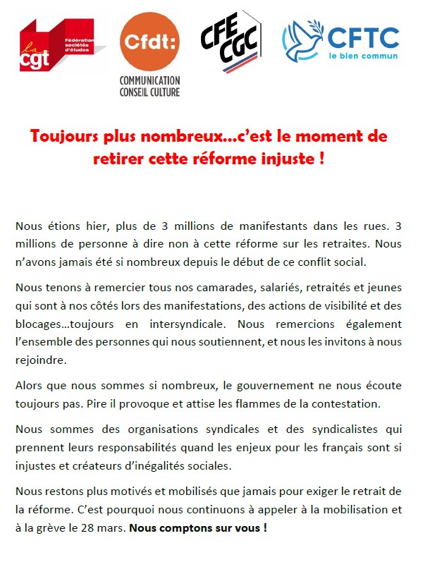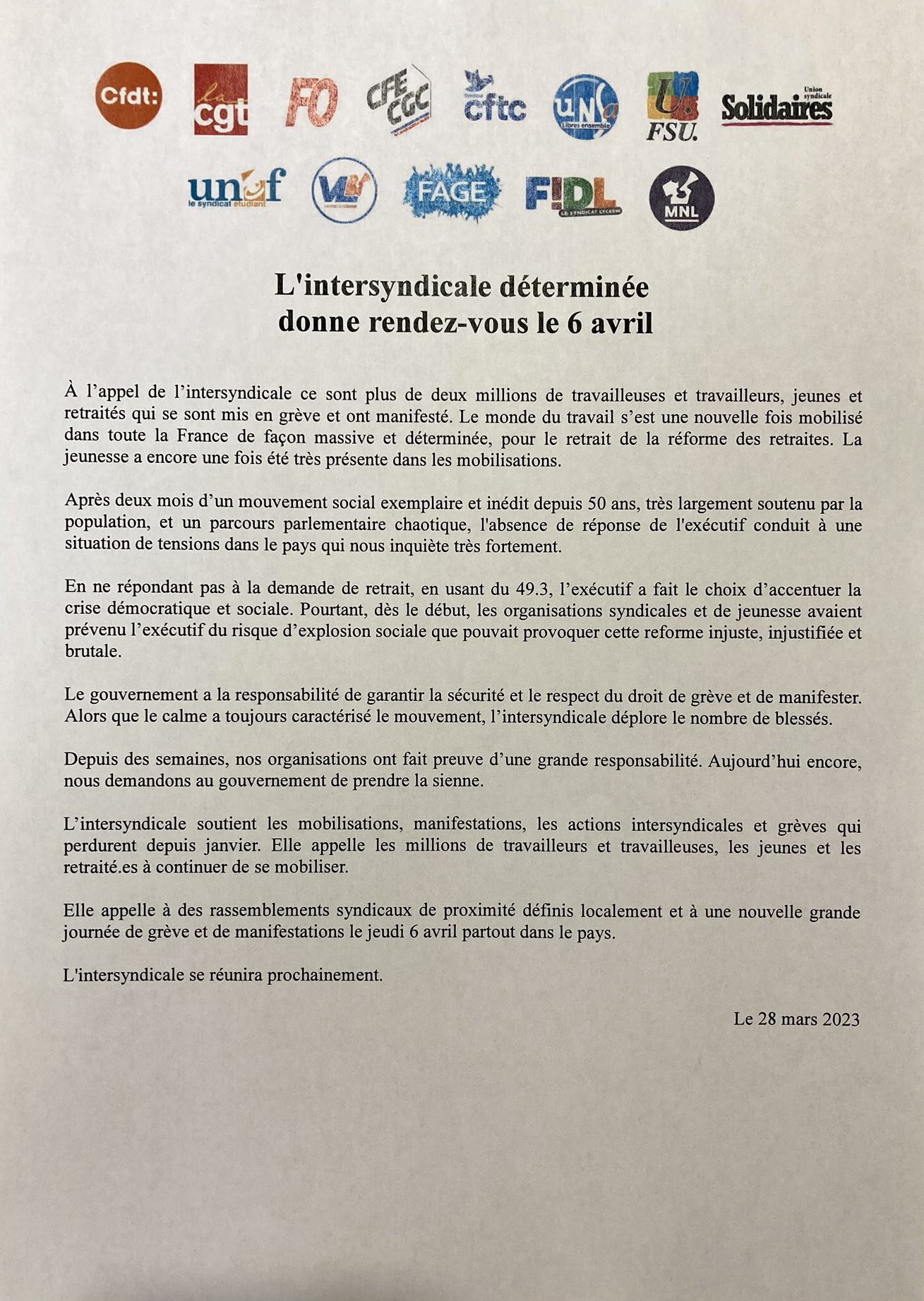 L’intersyndicale appelle à une journée de mobilisations et de grève le 13 avril et soutient toutes les actions et initiatives intersyndicales de mobilisations, y compris le 14 avril, pour gagner le retrait de cette réforme.