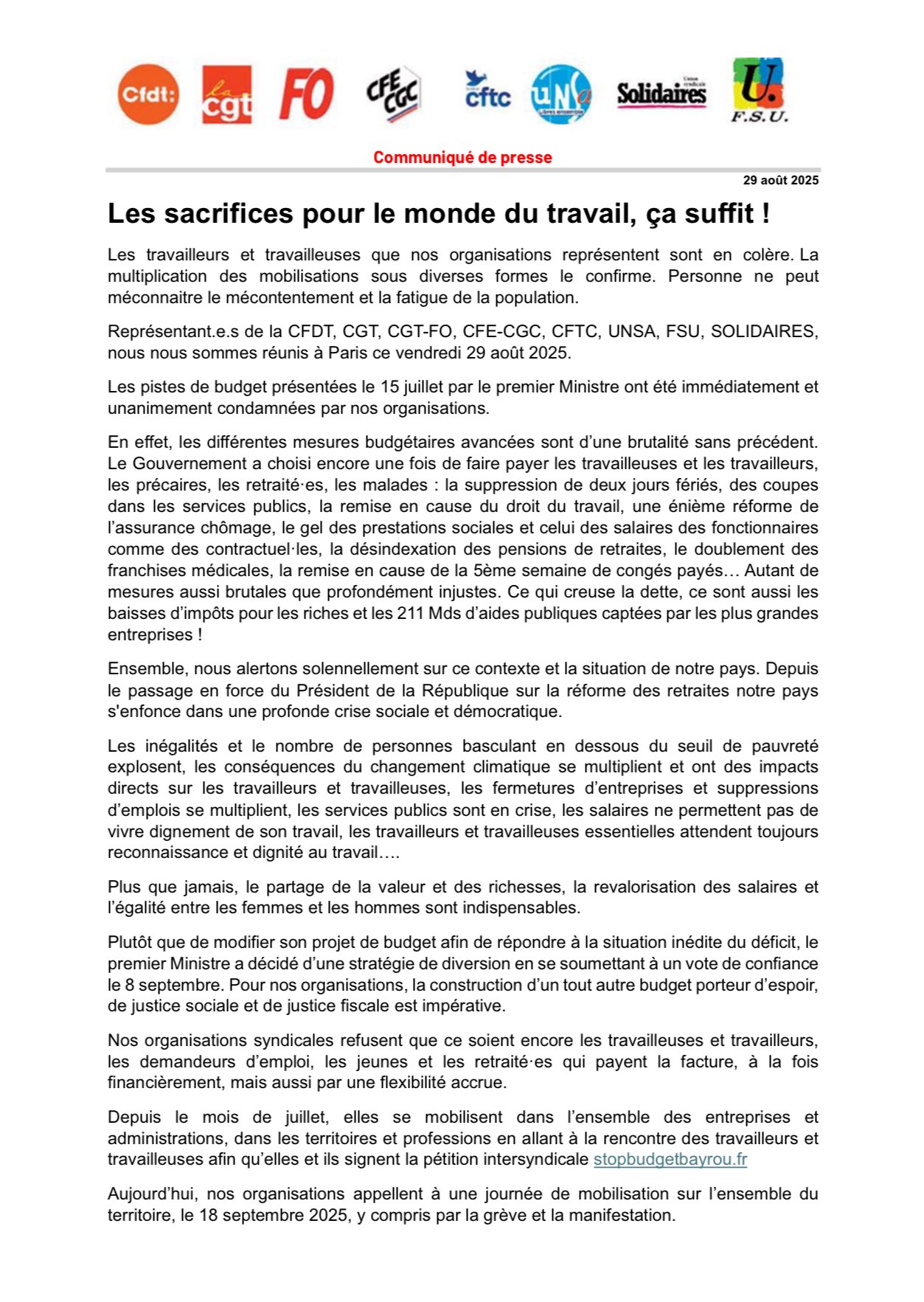 Communiqué de Presse intersyndical- Les sacrifices pour le monde du travail ça suffit !