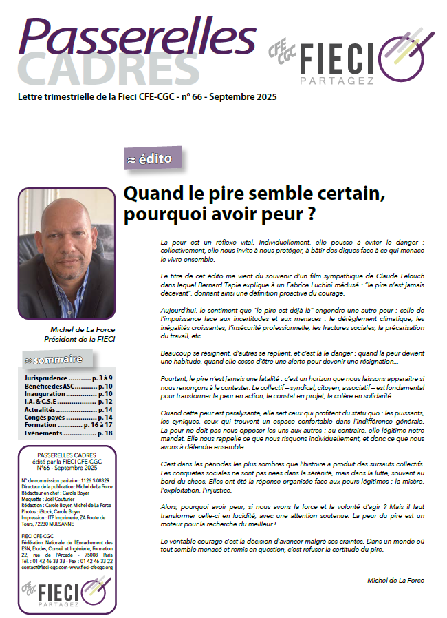 Télécharger Partager cet articleShare with FacebookShare with TwitterShare with LinkedInArticles similairesAucune réponse concrète aux attentes du monde du travail : l’intersyndicale appelle à une mobilisation massive le 2 octobre !25/09/2025Répondre au million de manifestant·es : l’intersyndicale lance un ultimatum19/09/2025La CFE-CGC a rencontré le nouveau Premier ministre16/09/2025Communiqué de Presse intersyndical branche des bureaux d’études – Les sacrifices pour le monde du travail ça suffit ! Pour une politique sociale plus juste14/09/2025Communiqué de Presse intersyndical- Les sacrifices pour le monde du travail ça suffit ! L’intersyndicale appelle à une journée de mobilisation le 18 septembre sur tout le territoire.29/08/2025Passerelles Cadres 65 – Vacances – Reprendre le droit au bonheur24/07/2025
