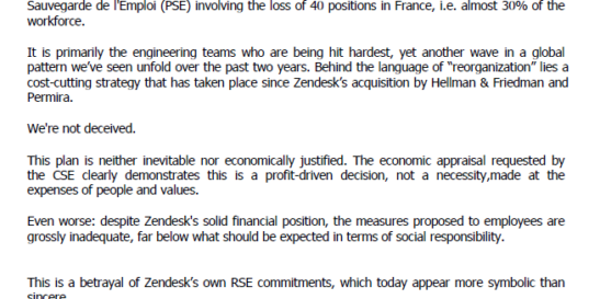 Le CSE de Zendesk France dénonce la suppression de 40 postes (30% des effectifs) – Employees Representatives condemns the loss of 40 jobs (30% of the workforce)