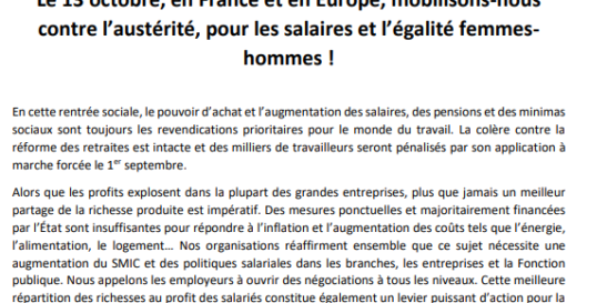 Communiqué intersyndical – Le 13 octobre, en France et en Europe, mobilisons-nous contre l’austérité, pour les salaires et l’égalité femmes- hommes !