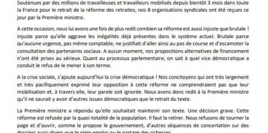 Réforme des retraites : les syndicats annoncent « l’échec » de leur rencontre avec Elisabeth Borne et refusent de « tourner la page » de la mobilisation